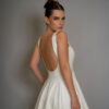 Vestido curto preto com aplicações em renda e decote profundo nas costas com aplicação de laço.