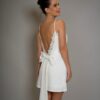 Vestido curto off white com aplicações em renda e decote profundo nas costas.
