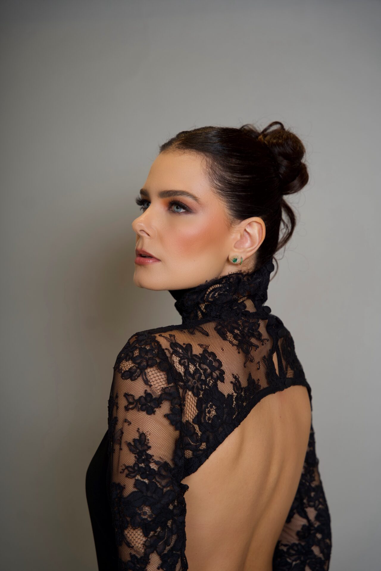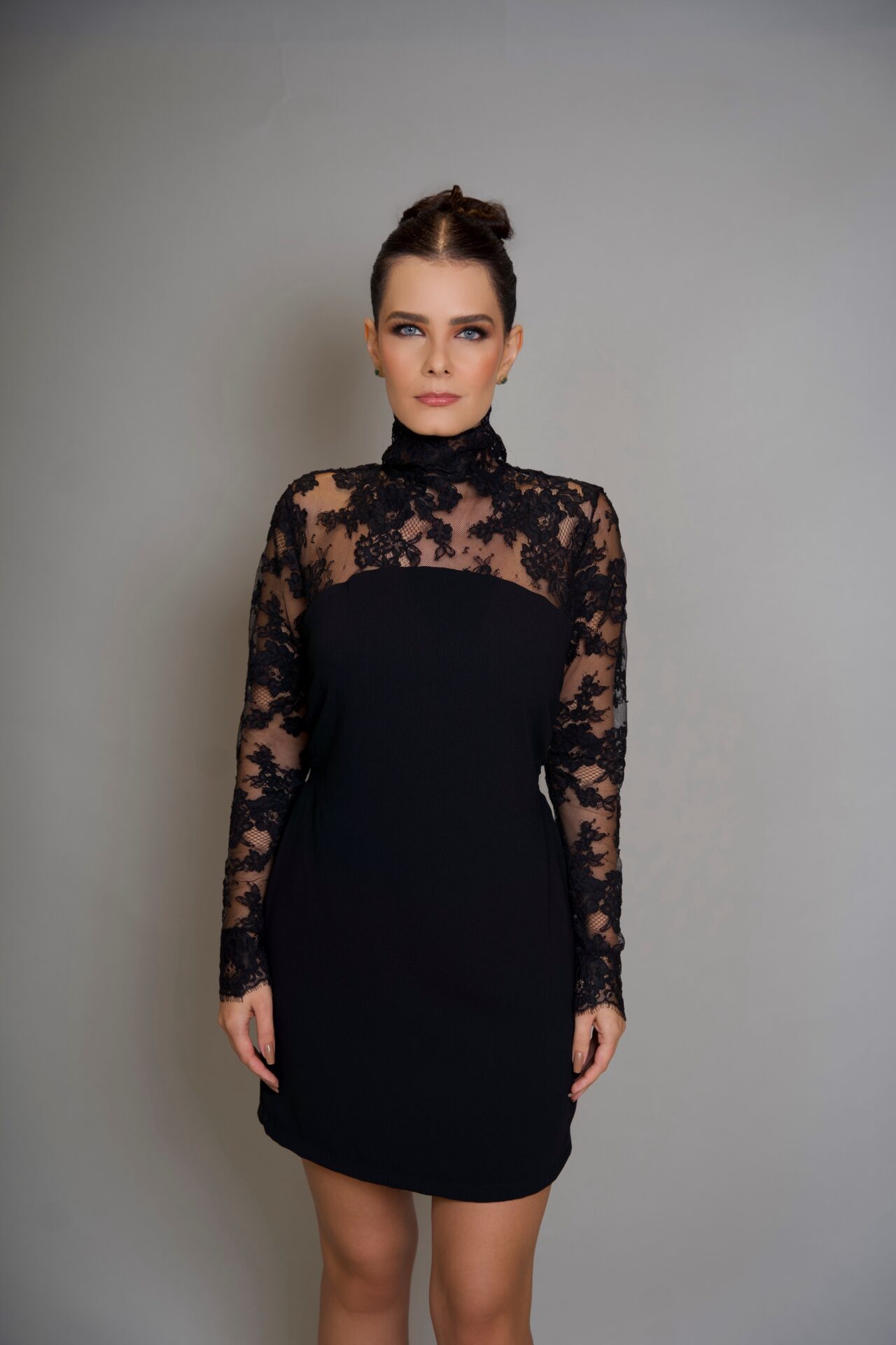 Vestido curto com mangas de renda e decote nas costas