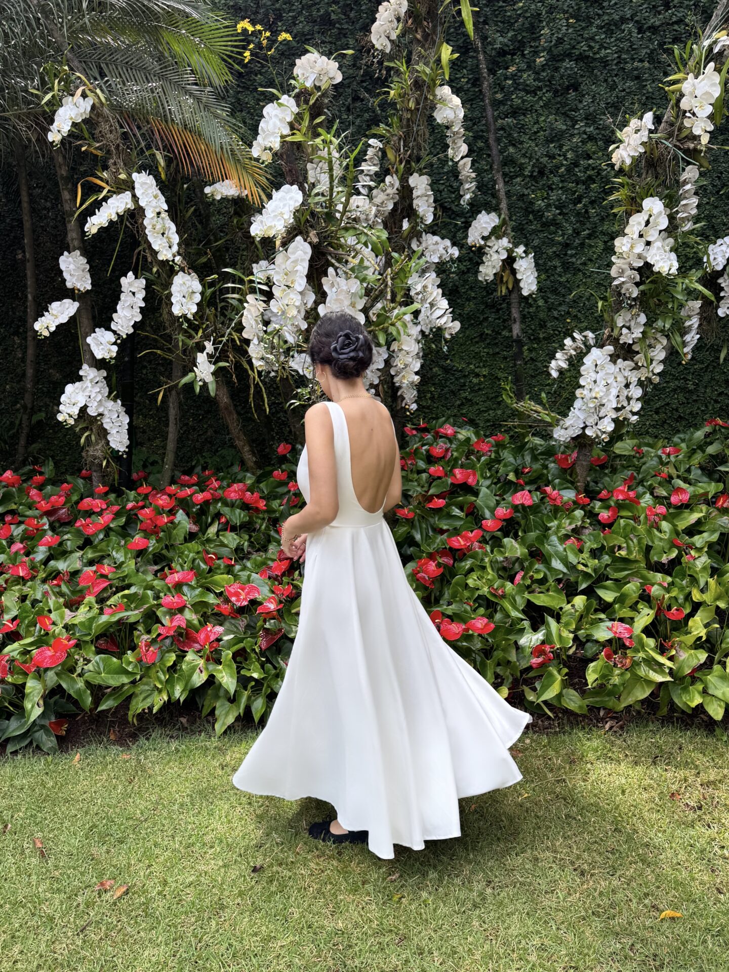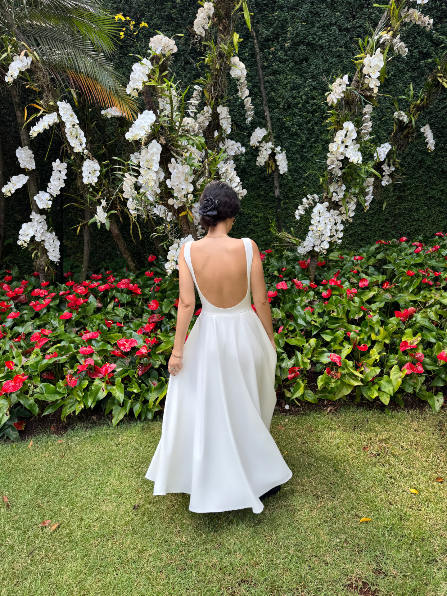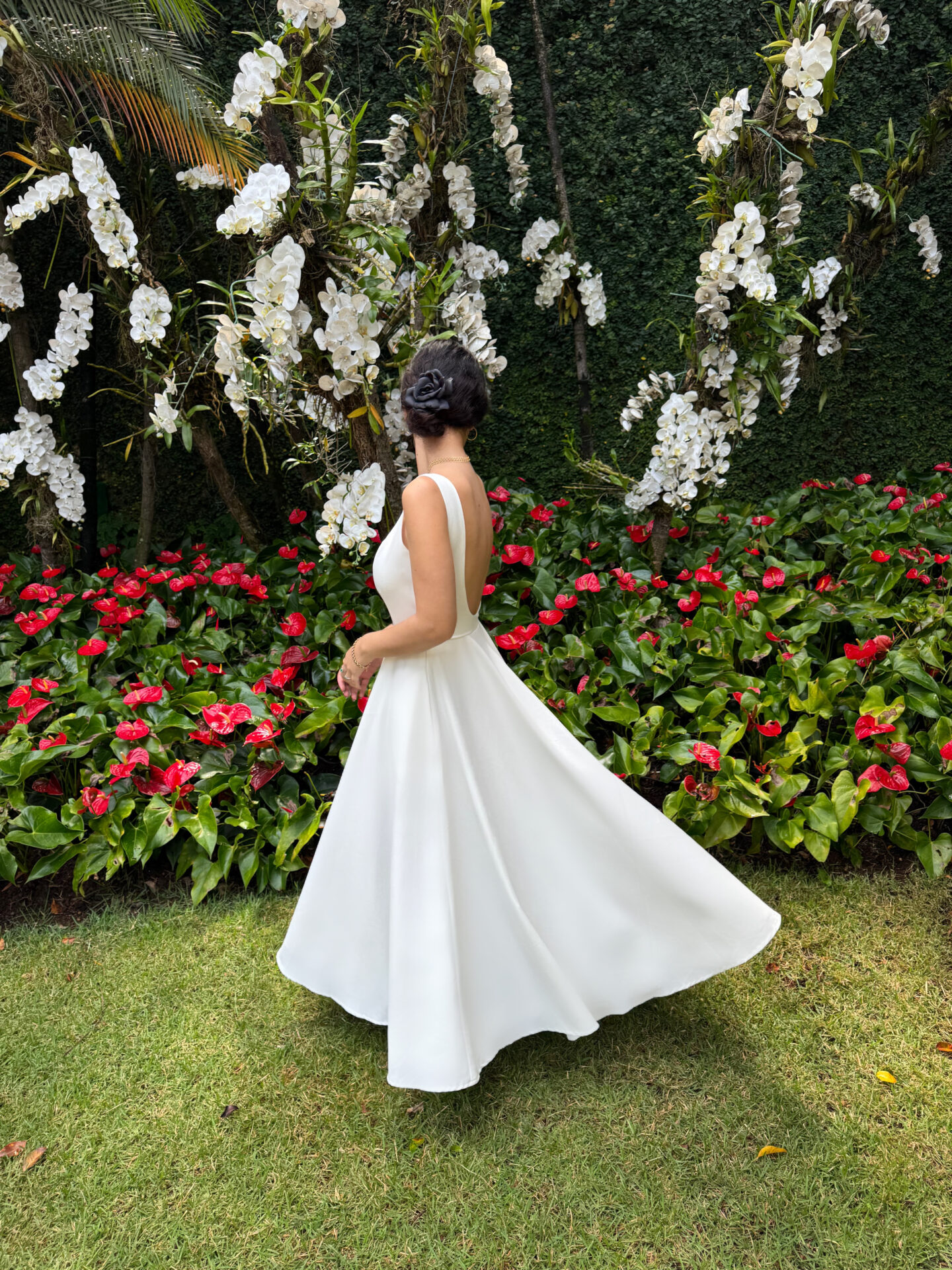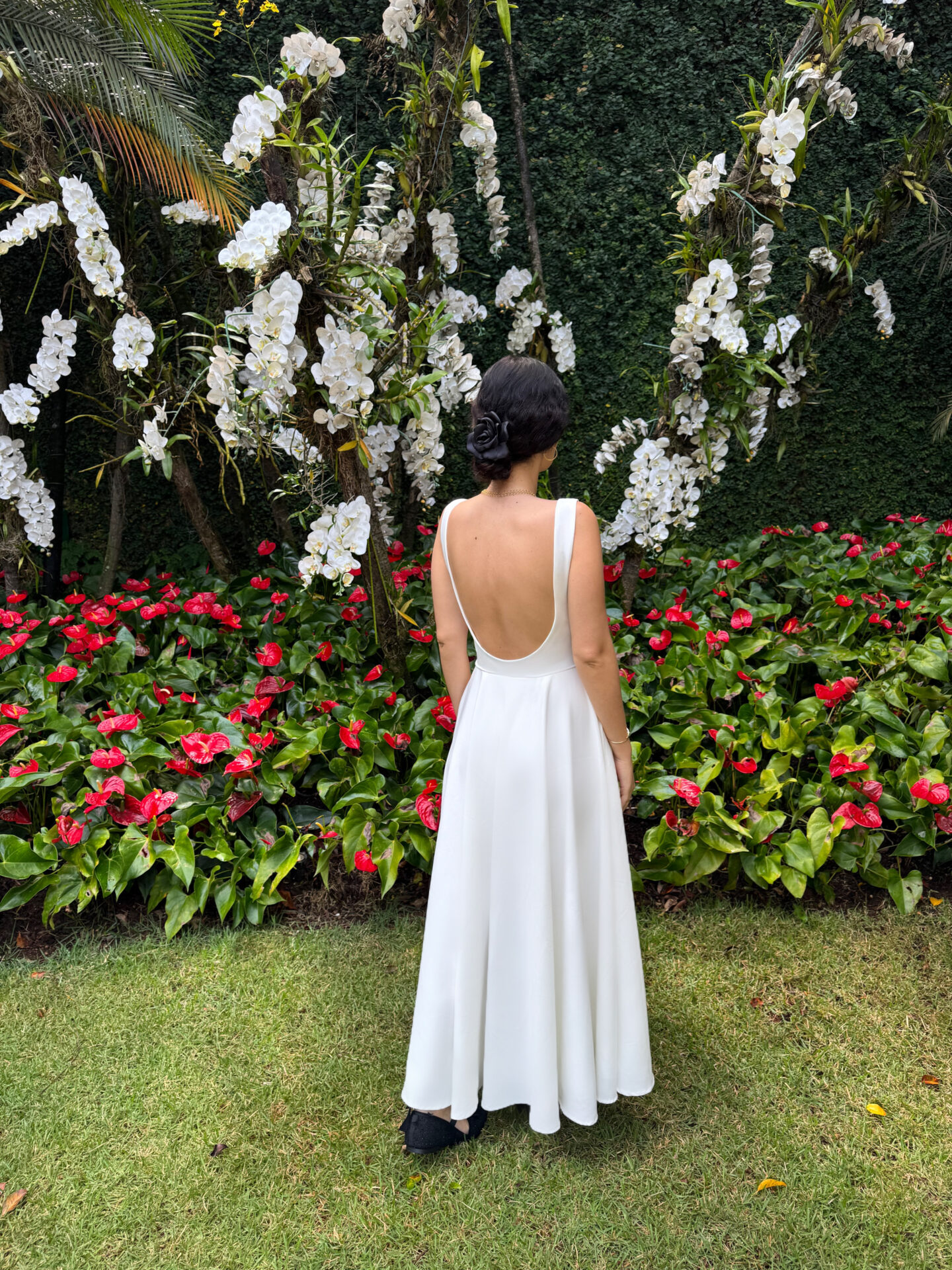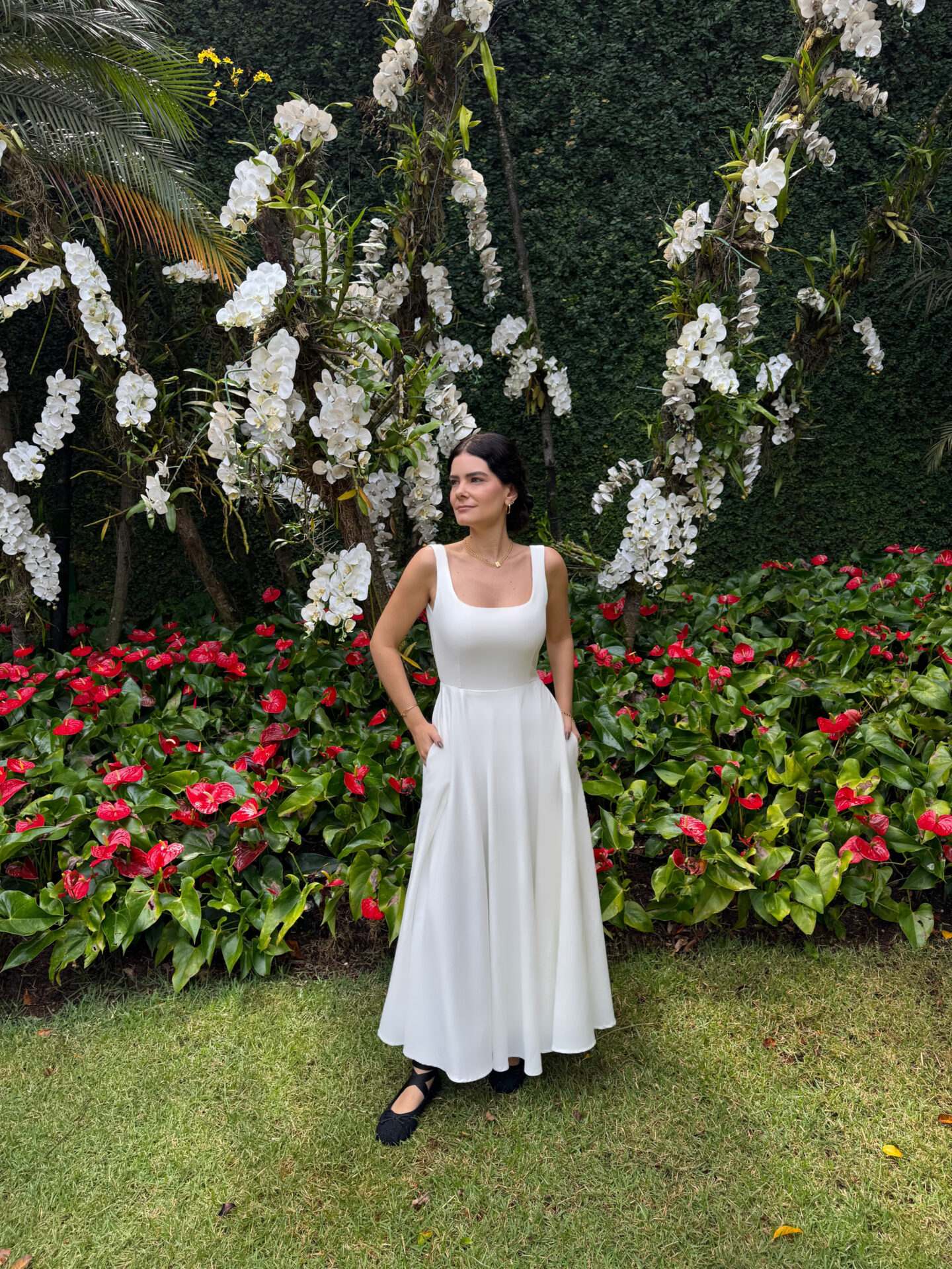 Vestido midi no crepe off white com a saia rodada, bolsos e decote arredondado nas costas. Vestido inteiro forrado com tecido acetinado.